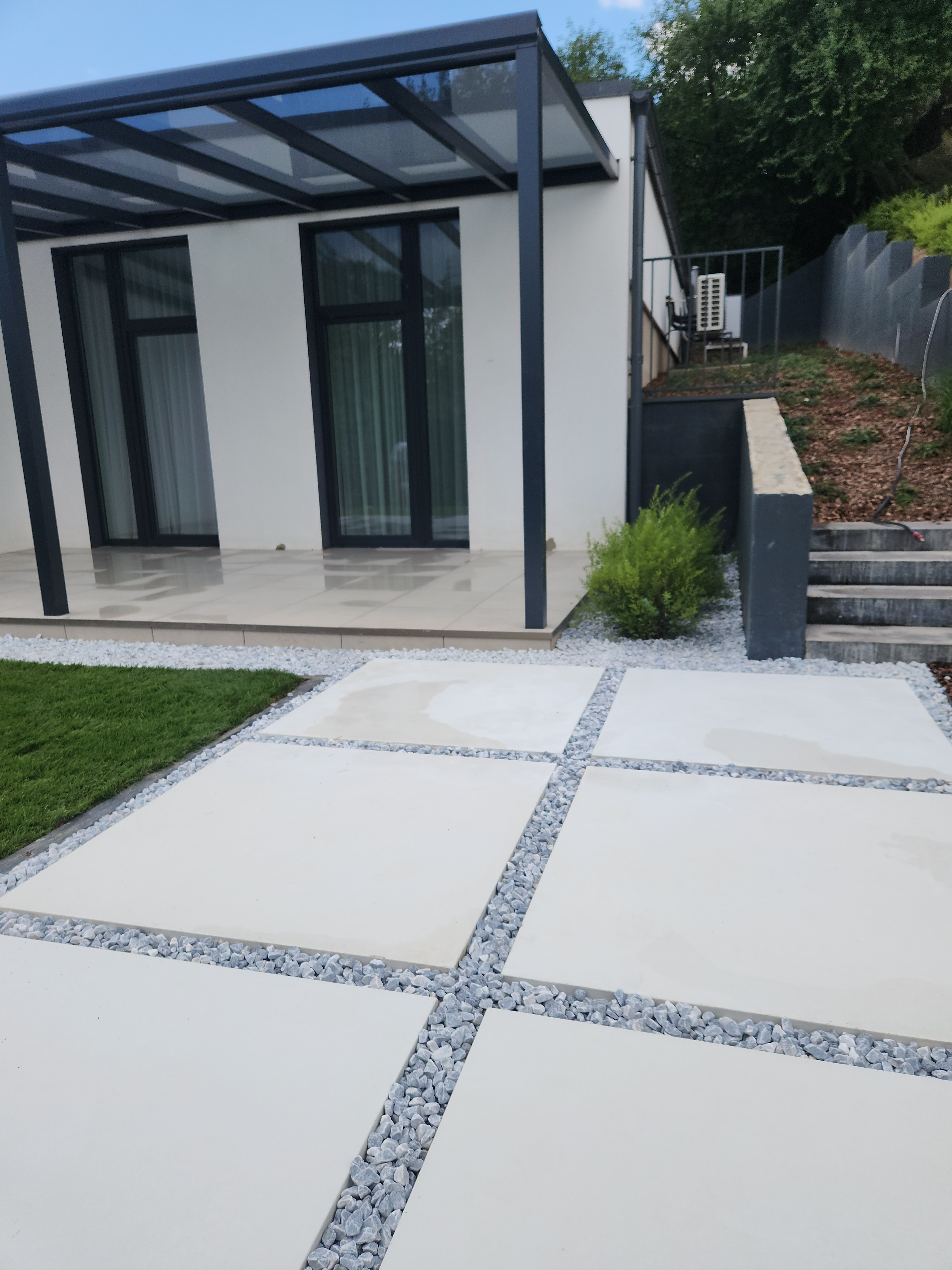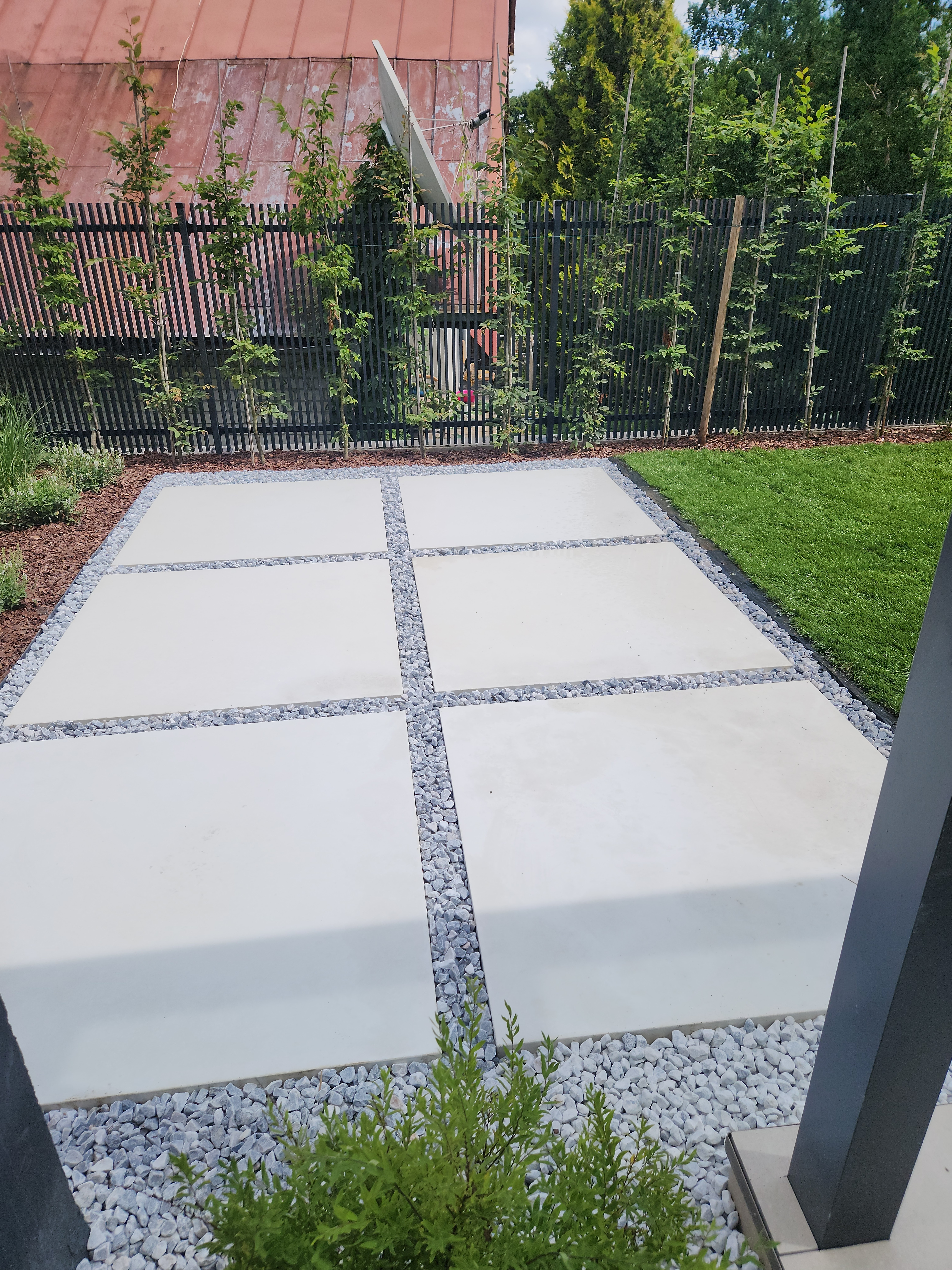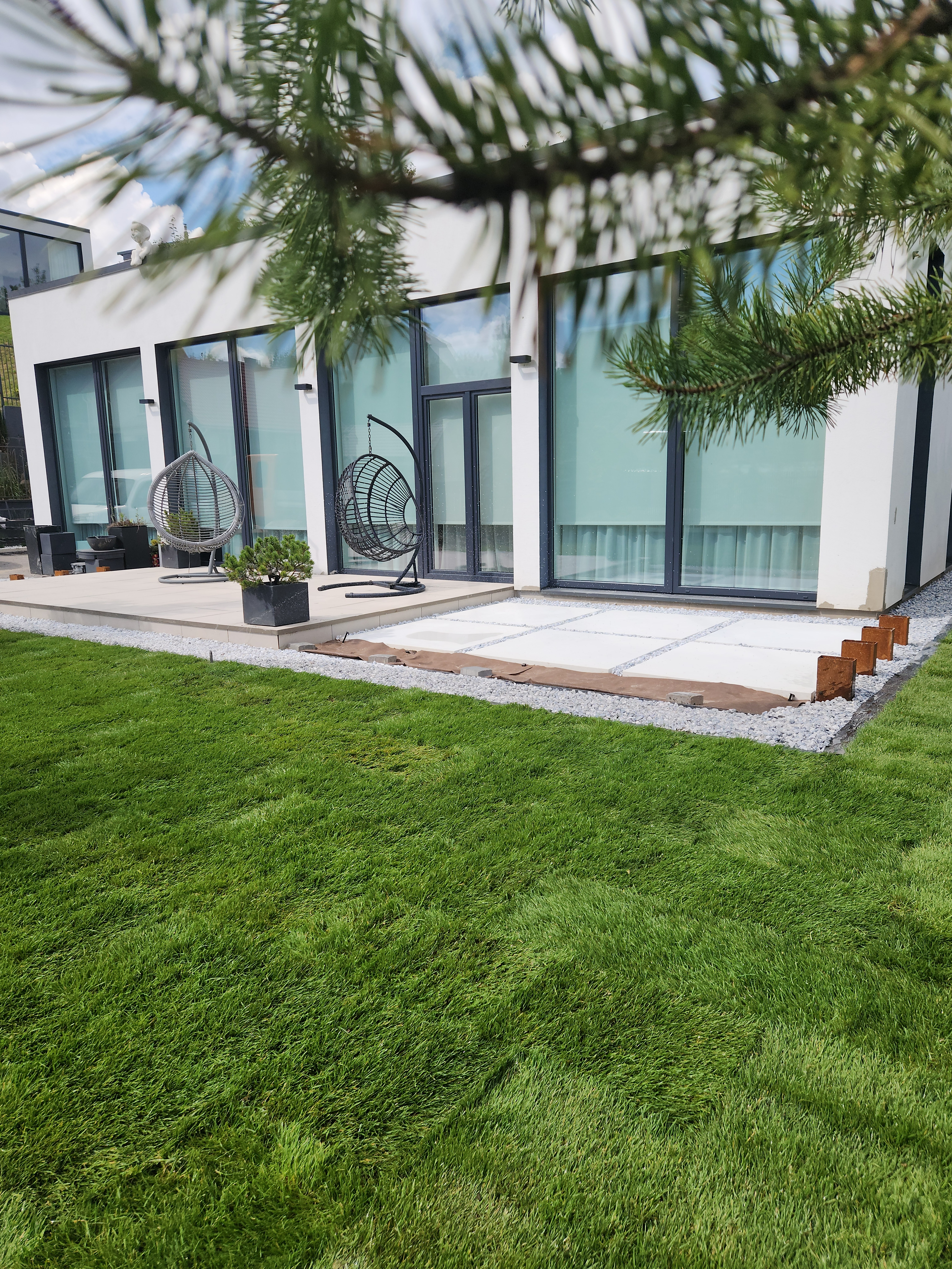 Modernus jaukus kiemas gausus žalumos, terasų iš plytelių ir didelio gabarito betoninių plokščiu buvo įgyvendintas nuo nulio pagal turima projektą.